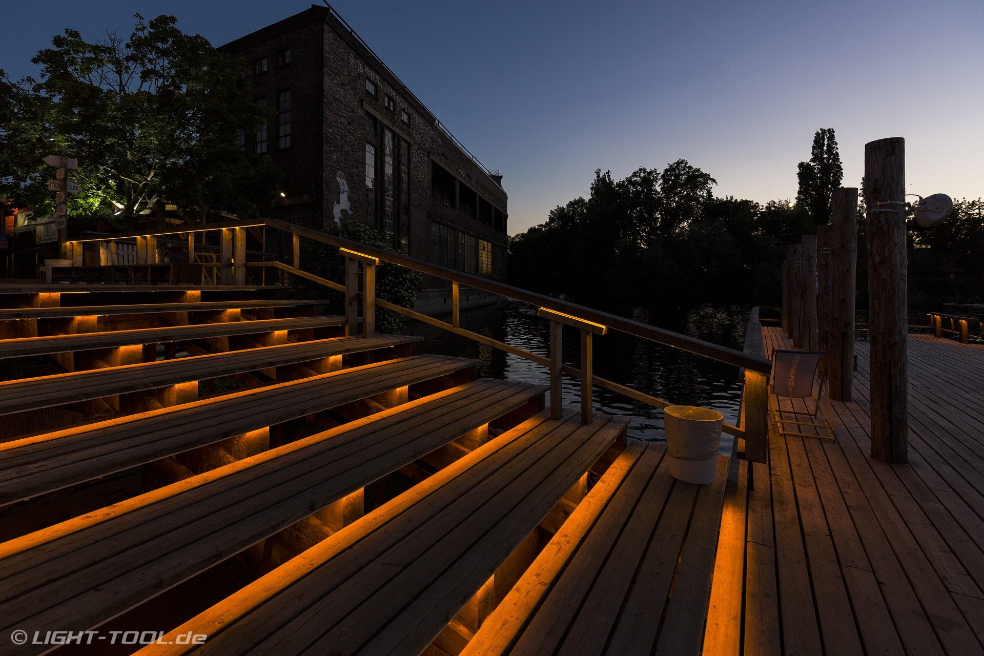 Für dieses Projekt haben wir im Auftrag der „Arena“ Berlin Betriebs GmbH, für die Steganlage zum Badeschiff, an den Geländern und Treppenstufen eine wasserfeste Sicherheitsbeleuchtung realisiert.